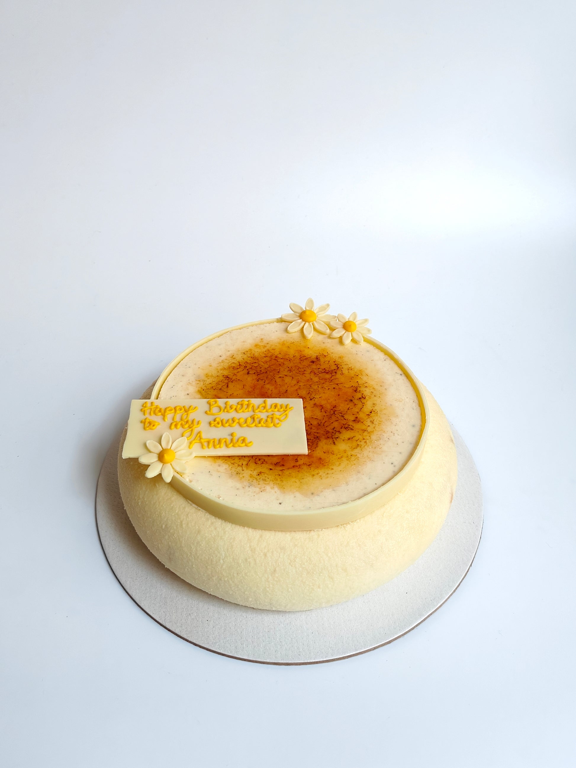 It begins with a soft vanilla sponge, followed by a smooth vanilla cremeux insert and a layer of smooth golden salted caramel. A feuilletine crunch adds texture, all wrapped in a light vanilla mousse. A layer of torched crème brulee sits atop for the final touch.